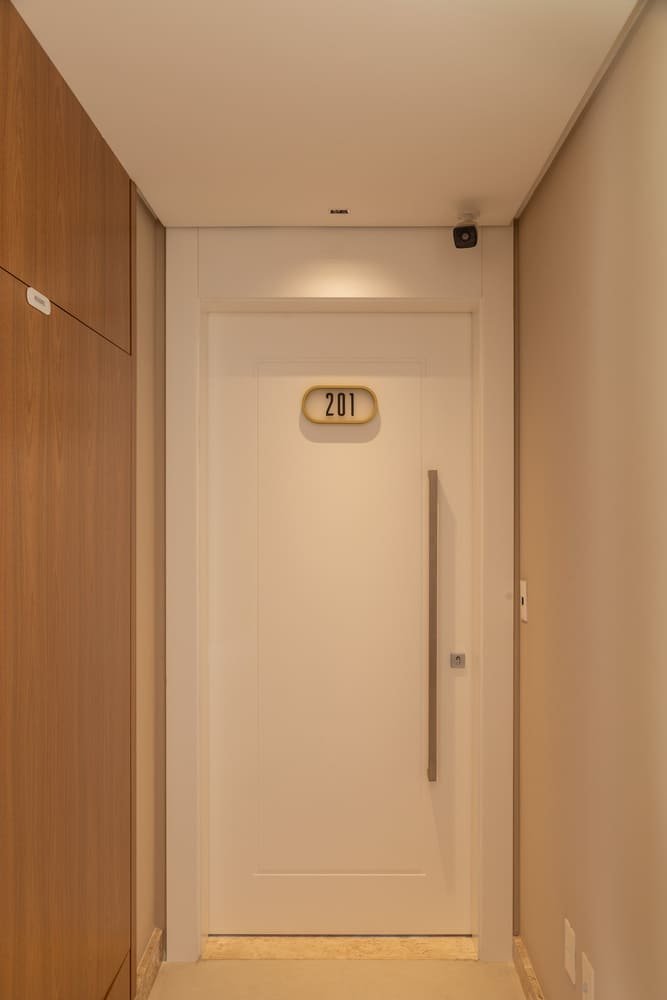 Diante das necessidades de orientação de fluxos, criamos uma base técnica comum para ambos os empreendimentos, diferenciando-os por meio de cores, formatos e acabamentos. Essa abordagem permitiu manter a unidade construtiva, ao mesmo tempo em que conectava o wayfinding à linguagem arquitetônica e aos materiais de cada projeto.