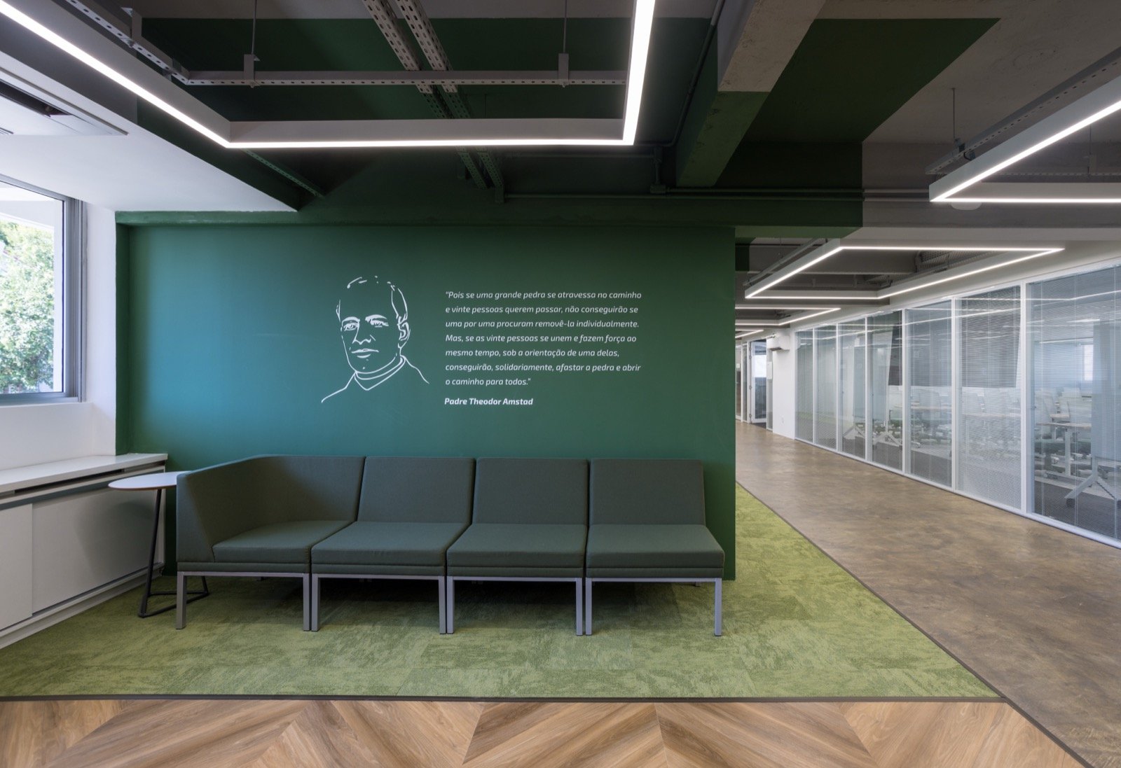 Adotamos uma abordagem multidisciplinar para simplificar os fluxos, assegurando unidade gráfica e leitura clara de todos os setores administrativos. A definição de pontos estratégicos de atuação do wayfinding e a criação de ambientações integradas resultaram em equilíbrio visual entre a arquitetura de interiores, as aplicações da marca e os elementos gráficos personalizados, reforçando a identidade da instituição.