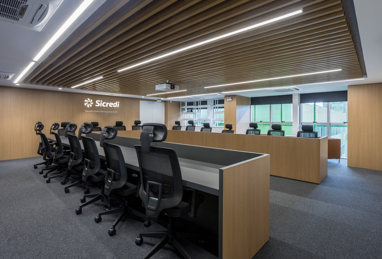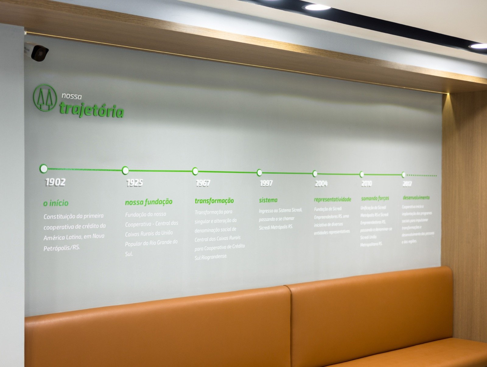 Partindo de um manual padronizado da rede Sicredi, o desafio foi personalizar o wayfinding design em um trabalho colaborativo com o escritório Departamento de Arquitetura (DA), responsável pelo projeto de retrofit da edificação. A proposta precisava considerar as características dos volumes construtivos pré-existentes, organizados em dois níveis por pavimento, garantindo funcionalidade e identidade própria à sede.